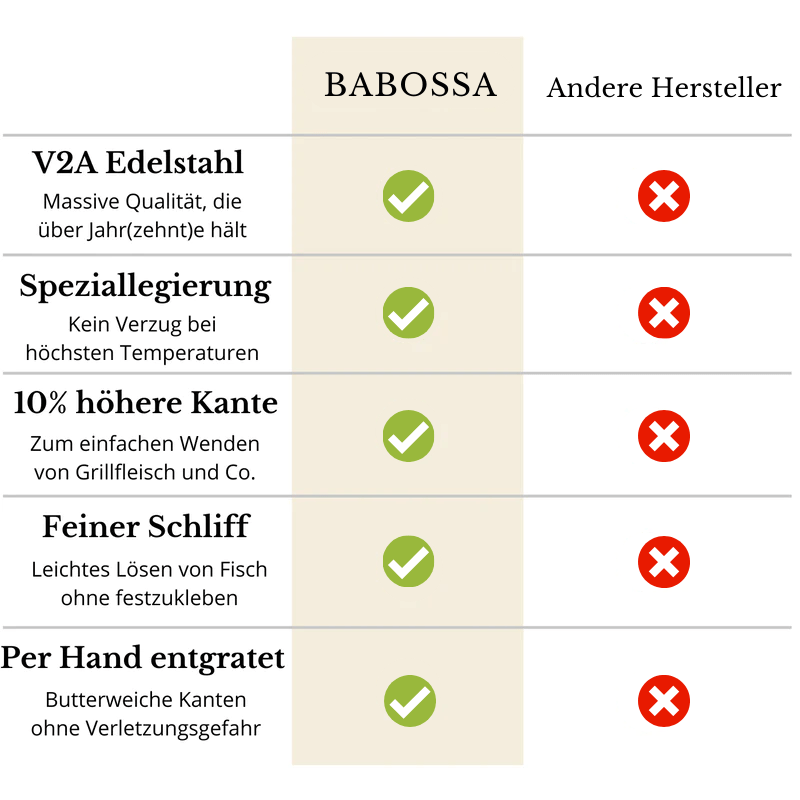 Unsere Brennerabdeckungen werden standardmäßig aus 1,5mm dickem V4A Edelstahl gefertigt und sind somit ca. doppelt so stark, wie die meisten Flammschutzbleche der Grillhersteller. Während selbst Premiumanbieter lediglich V2A Edelstahl verwenden, nutzen wir bei BABOSSA V4A Edelstahl, damit Ihr lange unbeschwert Freude und herrliche Grillerlebnisse mit unseren Flammschutzblechen erleben könnt. Diese sind deutlich Salz-, Säure-, Temperatur- und Feuchtigkeitsbeständiger und werden damit deutlich länger heben. Dadurch sind unsere Flammenverteiler das perfekte Ersatzteil für den Gasgrill.