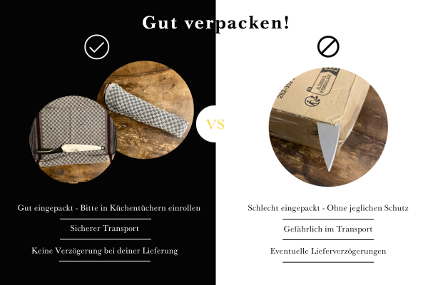 Achte beim Versand darauf deine geliebten Messer möglichst geschützt zu versenden. Das sorgt zum Einen dafür, dass sie keine Transportschäden erleiden und zum Anderen verhinderst du so, dass dein Karton beschädigt wird und es zu Verzögerungen im Versand kommt.